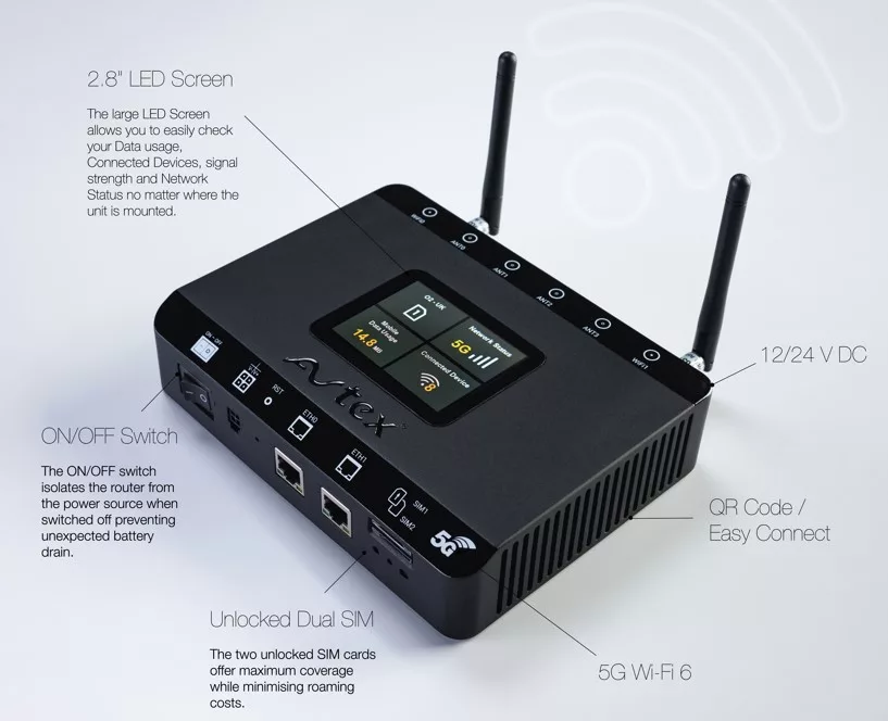 Stream Browse Share with the new high speed Avtex AMR105X 5G Wi-Fi 6 mobile router and 5G compatible antenna package. Designed specifically for the Leisure market the AMR105X has a 2.8” colour screen so you can easily monitor your router’s status, view information such as signal strength, service provider and monthly data usage. Our Dual Sim Router is fully unlocked to any network and even allows the user to toggle between LTE and WiFi when available to minimise roaming costs. The AMR105X antenna utilises the latest technology to fully support 3G, 4G and 5G. The AMR105X has a DC isolation switch to provide the option to power off the router when not in use to minimise battery consumption.