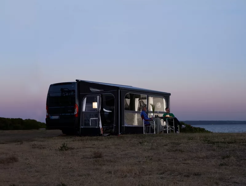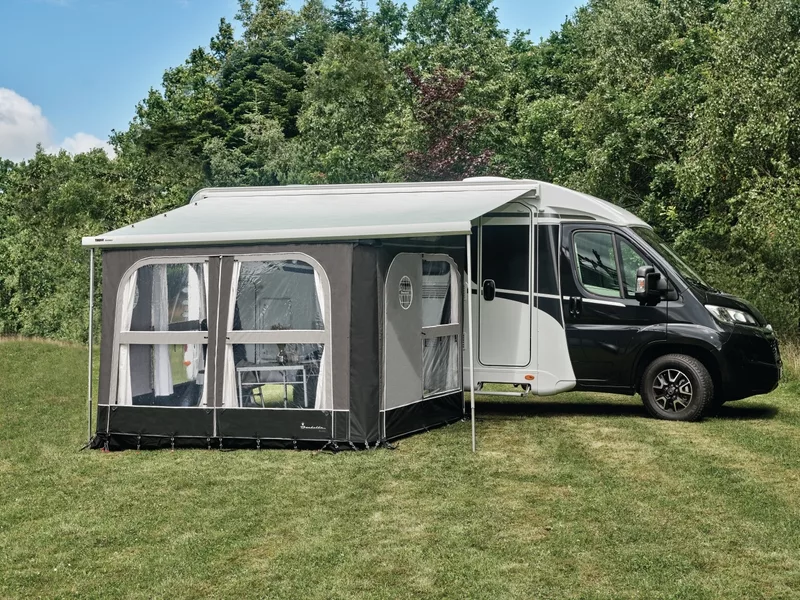 Will fit to Thule and Fiamma wind out awnings using strong magnets to hold the awning roof and side panels together, while the front simply zips on.