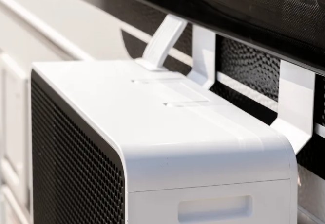 The split unit is hung in the window frame and is suitable for many types of camping vehicles.