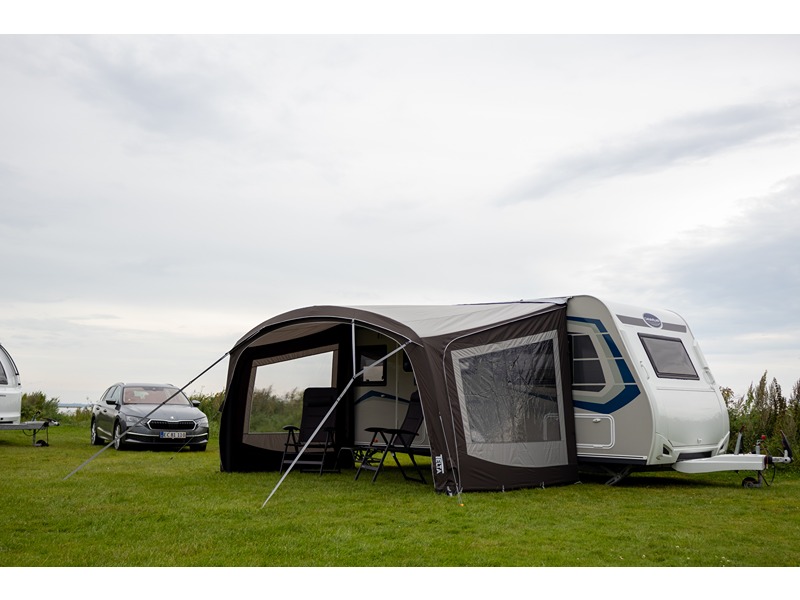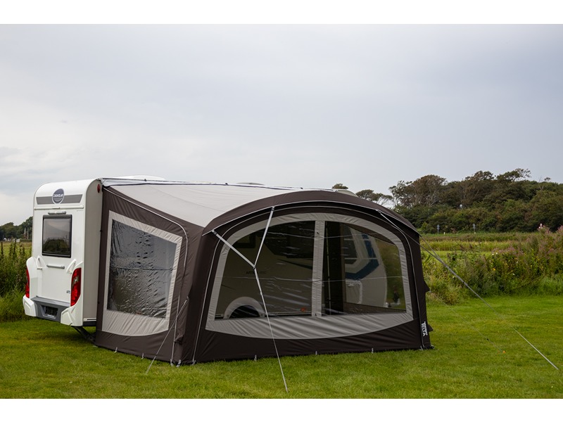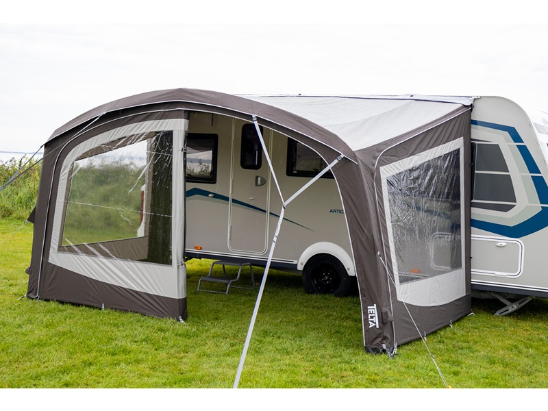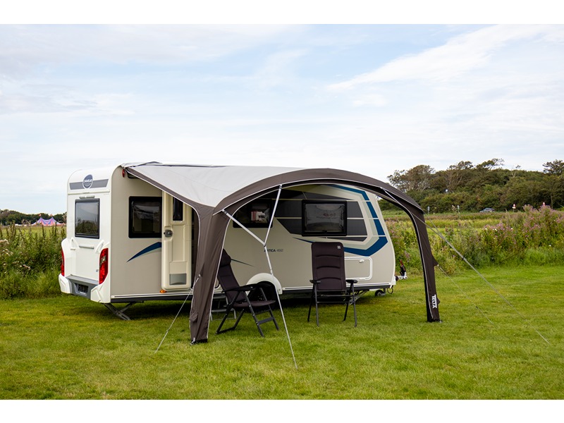 True Telta innovation, a lightweight air canopy that can stay on the side of your caravan whilst travelling!